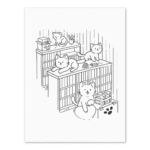 Designul „Raftul cu pisici” este o invitație la liniște, creat special pentru a aduce căldură oricărui colț de lectură sau spațiu de lucru. Ilustrația surprinde acel moment magic de tihnă într-o librărie unde micii „bibliotecari” blănoși veghează printre rafturi.